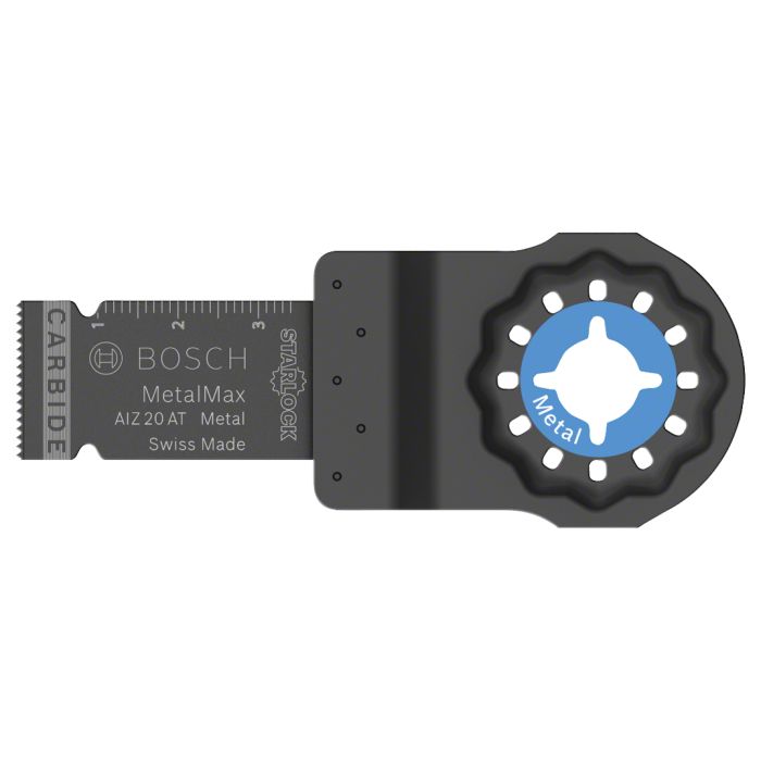 Das Tauchsägeblatt Starlock AIZ 20 AT MetalMax hat beim Schneiden von gehärtetem Metall eine 30-fach höhere Lebensdauer als Blätter aus Bimetall. Die hochwertigen Hartmetallzähne zertrennen robust und mit höchstem Verschleißwiderstand auch extremes Material, wie selbst gehärtetes Eisen und sehr abrasives Material. Dieses Blatt wird verwendet für anspruchsvolle Metallarbeiten in Edelstahl und Tauchschnitte in sehr abrasives Material. Es schneidet Metalle, Gipskartonplatten, Zementfaserplatten, faserverstärkte Kunststoffe sowie gehärtete Nägel und Schrauben. Dieses Produkt wird verwendet mit allen Elektrowerkzeugen des Typs Starlock, Starlock Plus und Starlock Max sowie allen gängigen Multifunktionswerkzeugen.