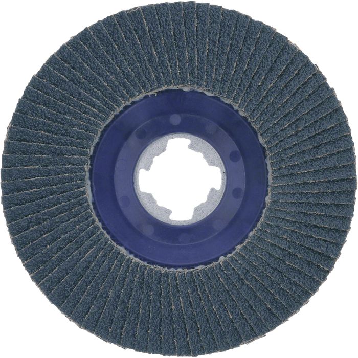 The X-LOCK Fächerschleifscheibe X571 Best for Metal bietet eine hervorragende Lebensdauer bei Metallarbeiten. Ihr Schleifflächenbesatz aus hochwertigem zirkoniumoxidverstärkten Halbedelkorundkorn ist bei ausgiebigen Arbeiten an Metall robust und verschleißfest. Die Scheibenträgerplatte ist sowohl gewinkelt als auch gerade erhältlich und besteht aus Glasfaser- oder Kunststoffmaterial.