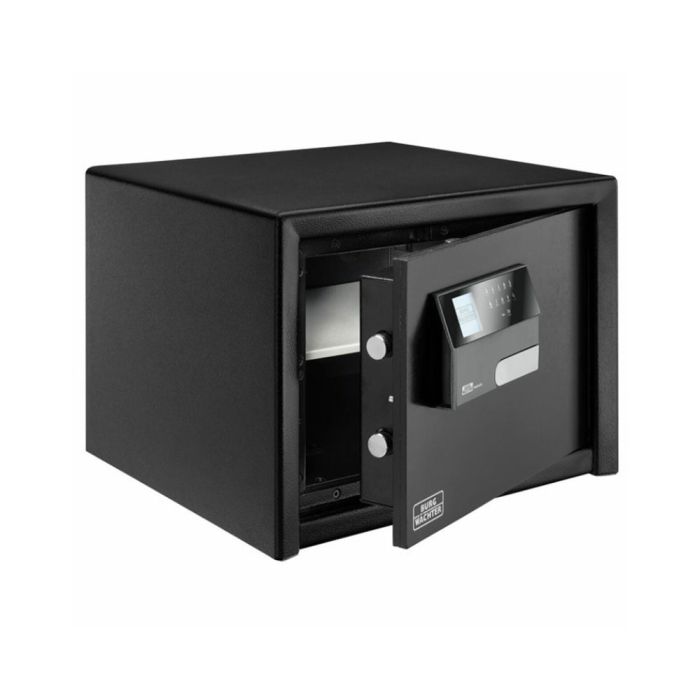 Die doppelwandige Konstruktion, ein innenliegendes Scharnier und massive 25 mm starke Rundbolzen mit zusätzlichem Schieberiegel sorgen für höchste Widerstandsfähigkeit gegen Aufbruchversuche. Eine hintergreifende Schiene an der Bandseite erhöht zusätzlich die Sicherheit. Für maximale Standfestigkeit lässt sich der Safe fest in Boden und Rückwand verankern – das passende Befestigungsmaterial ist selbstverständlich inklusive.