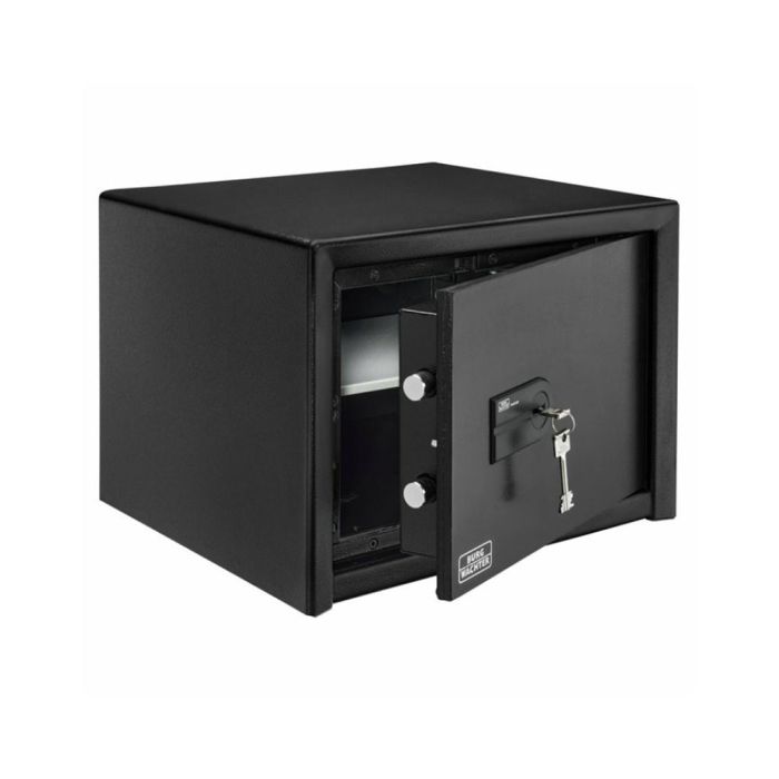 Die doppelwandige Konstruktion, ein innenliegendes Scharnier und massive 25 mm starke Rundbolzen mit zusätzlichem Schieberiegel sorgen für höchste Widerstandsfähigkeit gegen Aufbruchversuche. Eine hintergreifende Schiene an der Bandseite erhöht zusätzlich die Sicherheit. Für maximale Standfestigkeit lässt sich der Safe fest in Boden und Rückwand verankern – das passende Befestigungsmaterial ist selbstverständlich inklusive.