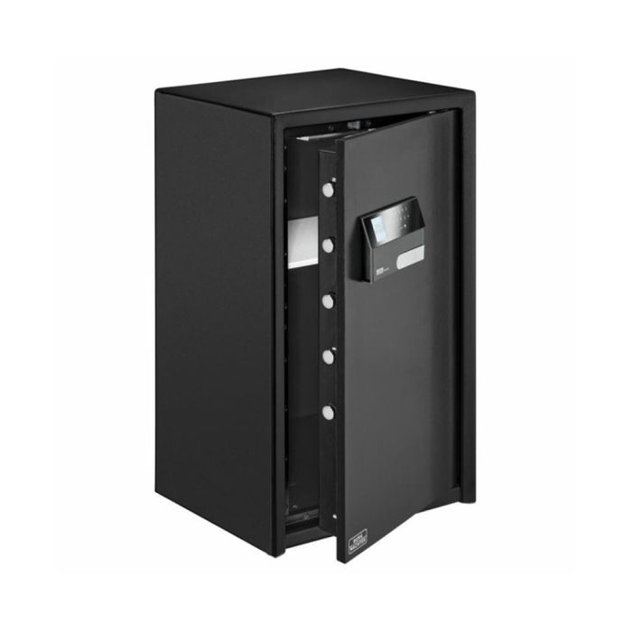 Die doppelwandige Konstruktion, ein innenliegendes Scharnier und massive 25 mm starke Rundbolzen mit zusätzlichem Schieberiegel sorgen für höchste Widerstandsfähigkeit gegen Aufbruchversuche. Eine hintergreifende Schiene an der Bandseite erhöht zusätzlich die Sicherheit. Für maximale Standfestigkeit lässt sich der Safe fest in Boden und Rückwand verankern – das passende Befestigungsmaterial ist selbstverständlich inklusive.