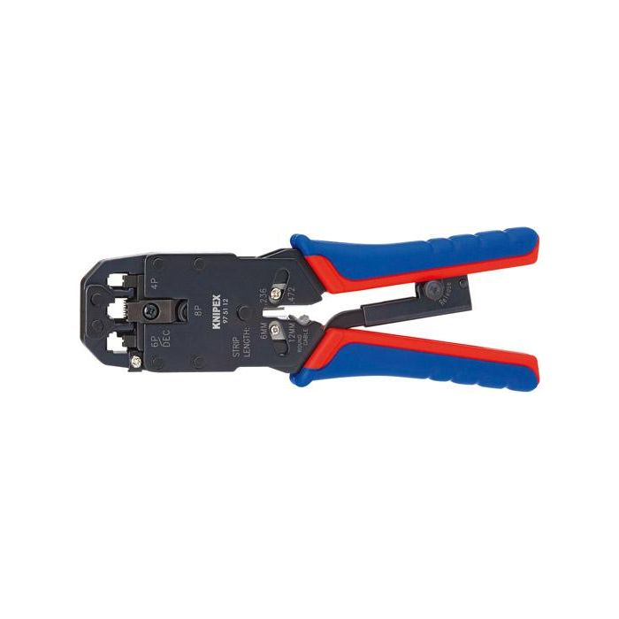 • Kopf brüniert • Griffe mit Mehrkomponenten-Kunststoffhüllen • Chrom-Vanadium-Elektrostahl • Öffnungsfeder • Gleichbleibend hohe Crimpqualität durch Zwangssperre, entriegelbar • Exakter Crimpvorgang durch Parallelvercrimpung • Schneiden und Abmanteln von flachem, nicht abgeschirmtem Telefonkabel • Längenabschneider und Abmantelungsmesser für Flachkabel 6 und 12 mm Länge • Zusätzliche Abisolierfunktion für Rundkabel • Kraftverstärkung durch Hebelübersetzung für ermüdungsarmes Arbeiten • Zum Verpressen von Westernsteckern