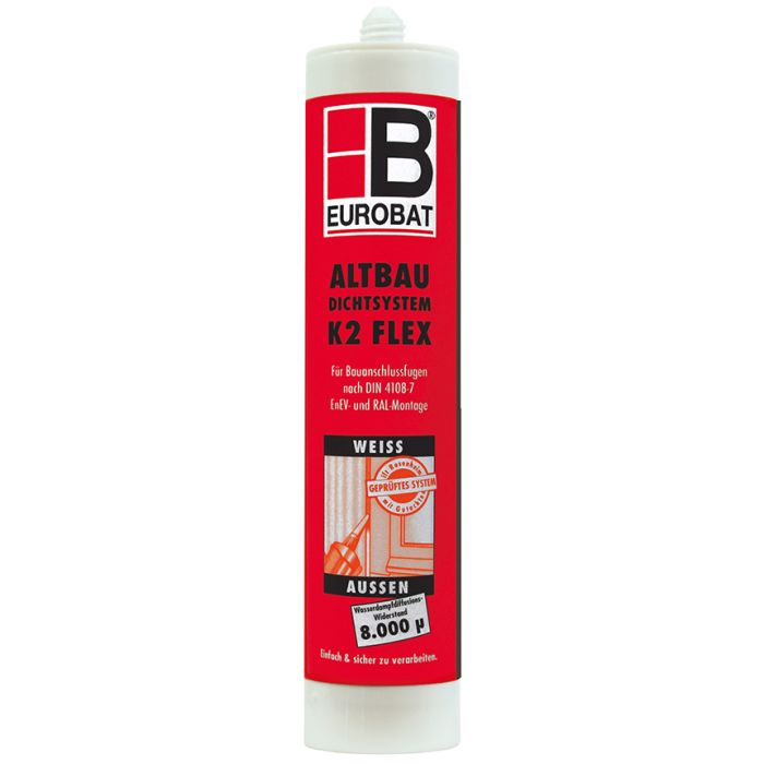 EUROBAT Altbau-Dichtsystem K2 Flex Außen ist ein hochwertiger, dauerelastischer, einkomponentiger Spezialdichtstoff zum fachgerechten Dichten der Bauanschlussfuge (Fenster / Türen / Fensterbank) nach DIN 4108-7 EnEV- und RAL-Montage im Außenbereich.