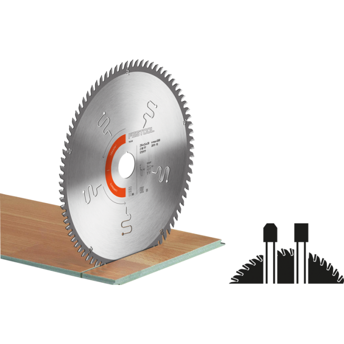 • Spezial-Sägeblatt zum Bearbeiten von beschichteten Platten, Laminat-Paneele, Melaminharzplatten, Mineralstoffen sowie phenolharzgebundenen Fasern und Gewebe