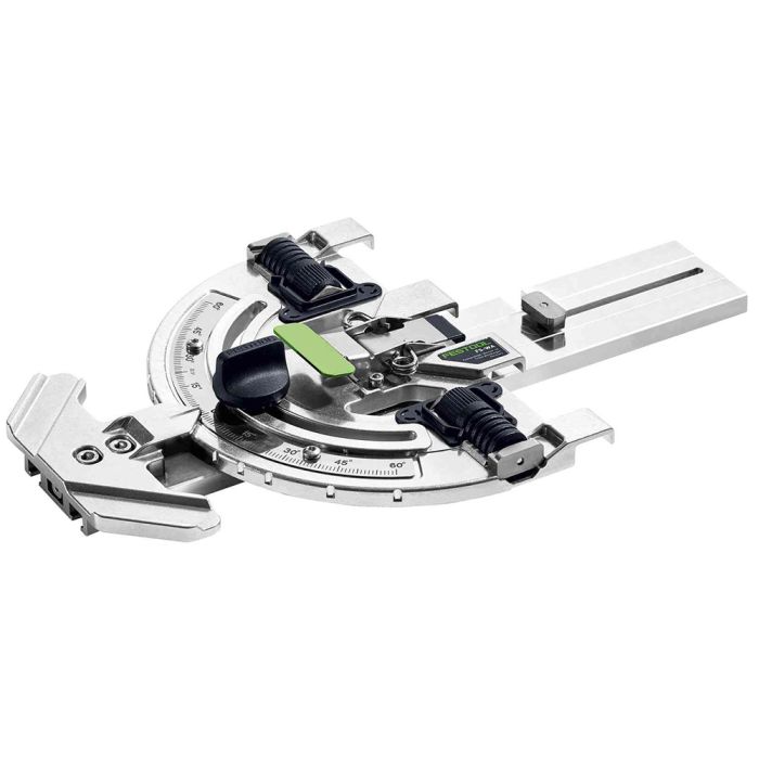Der Winkelanschlag für die Führungsschiene – für präzise und schnelle Winkelschnitte. Winkel von -60° bis +60° können wiederholgenau und in hoher Präzision eingestellt werden. Der Winkelanschlag bietet damit einen großen Einsatzbereich und volle Flexibilität. Dank Schnellspannhebel ist der Winkelanschlag intuitiv und im Handumdrehen an der Führungsschiene angebracht und wird in Kombination mit Handkreissäge und Säge- und Arbeitstisch zur mobilen Plattensäge. Konzipiert für das Erzielen exakter, geführter Winkelschnitte.