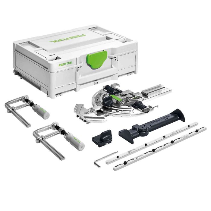 Alles, was die Führungsschiene noch besser macht, in einem Systainer³: Schraubzwingen, Winkelanschlag, Abweiser, Rückschlagstopp, Verbindungsstücke und Splitterschutz.