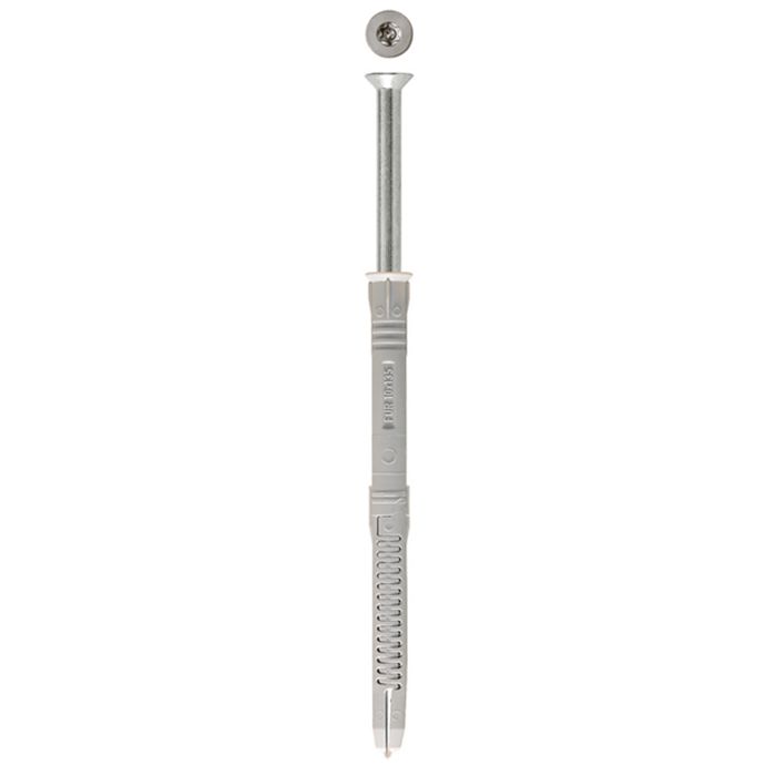 Der fischer Langschaftdübel FUR T besteht aus einer Dübelhülse aus hochwertigem Nylon und einer Senkkopfschraube aus galvanisch verzinktem Stahl. Der FUR-T wird in der zeitsparenden Durchsteckmontage gesetzt. Beim Eindrehen der Schraube verspreizen im Vollbaustoff die Lamellen gleichmäßig gegen die Bohrlochwand.