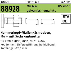 Artikel 88928 Mu 4.6 HS 28/15 galvanisch verzinkt Hammerkopf-/Halfen-Schrauben,mit Sechskantmutter