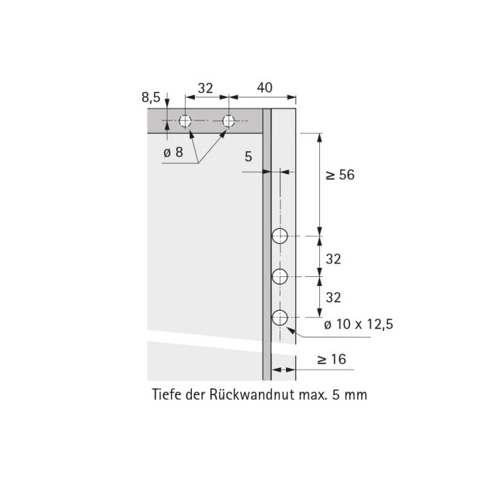 • Rückwandversprung (bis Hinterkante Rückwand) min. 16 mm