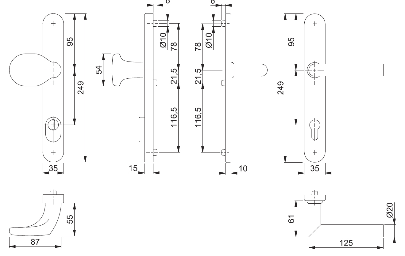 • Lagerung: außen gekröpfter Knopf fest, ummontierbar; innen Türgriff fest/drehbar, Rückholfeder, wartungsfreies Gleitlager