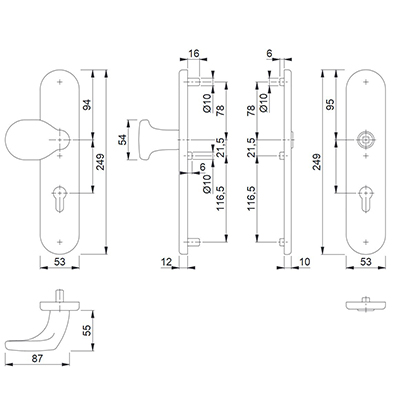 • Lagerung: außen gekröpfter Knopf fest, ummontierbar; innen für Türgriff lose, Rückholfeder rechts/links verwendbar, wartungsfreies Gleitlager