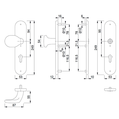 • Lagerung: außen gekröpfter Knopf fest, ummontierbar; innen für Türgriff lose, Rückholfeder rechts/links verwendbar, wartungsfreies Gleitlager