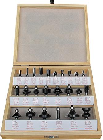 • Hartmetall-bestückte Schneiden • Schaft-Ø 8 mm • Für Weichholz, Hartholz und beschichtete Plattenwerkstoffe Lieferung: Im Holzkasten.