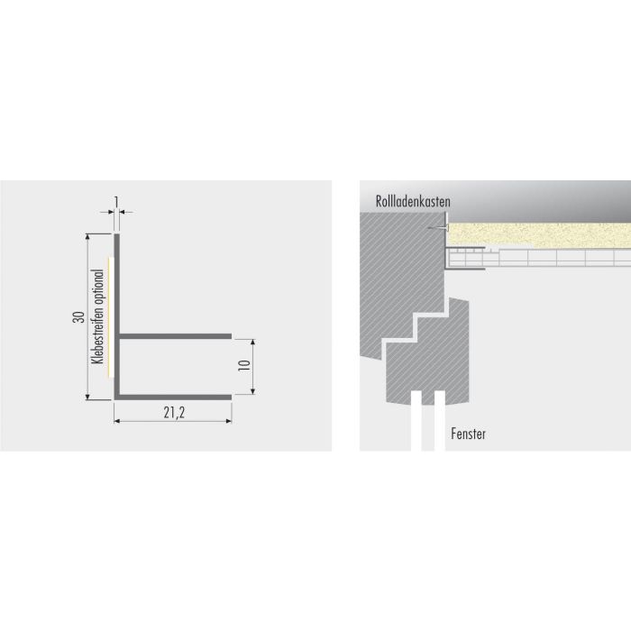 Das F-Profil eignet sich bei fehlender Passnut oder größeren bauseitigen Toleranzen zum Ausgleich zwischen Rollladenkastendeckel und Fensterrahmen.