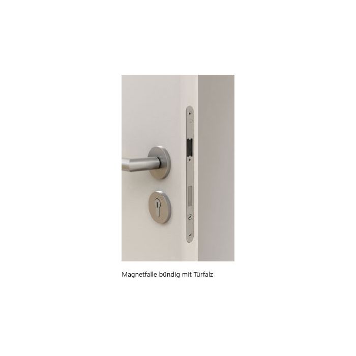 Das Besondere an der Magnetfalle ist, dass sie bei geöffneter Tür im Schlosskasten verborgen bleibt. Zarge und Türblatt bilden eine Ebene. Da die Falle so beim Schließen nicht über das Schließblech gleitet, entsteht an dieser Stelle keine unschöne Abnutzung und Geräuschkulisse. Dank moderner Magnetfallentechnik schließt die Tür sanft und leise. Erst bei geschlossener Tür wird die Falle durch einen, im Schließblech verbauten, Magneten angezogen. Durch die integrierte Höhenverstellung eignet sich das Schloss speziell für hochwertige, moderne oder schwere Drückergarnituren.