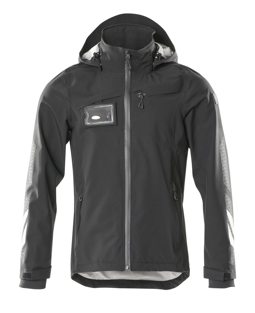 Atmungsaktiv, wind- und wasserdicht. Brusttasche mit Reißverschluss. Regulierbarer Gummizug am unteren Saum. Vordertaschen mit Reißverschluss. Kapuze ist abnehmbar, gefüttert und mit verstellbaren Elastikschnüren versehen. ID-Kartenhalter ist abnehmbar. Innentasche mit Reißverschluss. Verschluss mit Reißverschluss und doppelter Wetterschutzleiste. Verschluss mit Reißverschluss und inwendiger Wetterschutzleiste. Verschluss mit Reißverschluss und Wetterschutzleiste. Leichte Meterware. Mit Druck und Reflexen. Rippenbündchen (verdeckt unter der Wetterschutzleiste) an den Handgelenken. Nähte sind verklebt. Wind- und wasserdicht.
