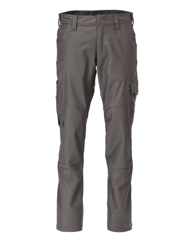 Zweifache Kappnähte an den Beinen und im Schritt. Niedrige Taille. Gürtelschlaufen. D-Ring. Verdeckter Knopfverschluss. Hosenschlitz mit Reißverschluss. Hosenbeine sind ergonomisch geformt. Vordertaschen. Gesäßtaschen. Schenkeltasche mit Handyfach, Patte und verdeckten Druckknöpfen. Zollstocktasche, verstärkt, mit kleiner Tasche außen.