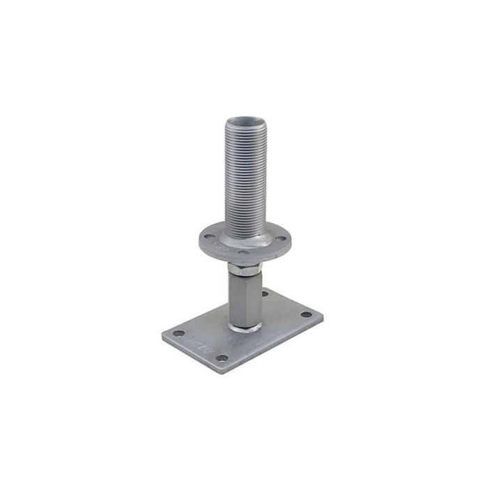 Obere Gewindestange (M 24 x 150 mm rechts) wird durch die obere Platte geschraubt und mit Mutter gesichert. Dadurch ist eine Grobeinstellung von 50 mm und eine Feineinstellung nach fertiger Montage über die rechts/links Muffe bis zu 65 mm möglich (komplette stufenlose Verstellbarkeit von 115 mm).
