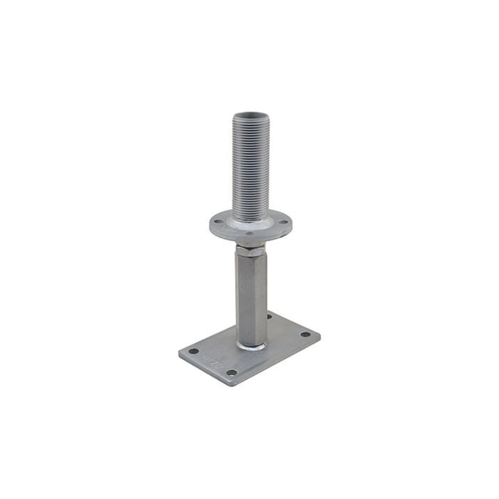 Obere Gewindestange (M 24 x 150 mm rechts) wird durch die obere Platte geschraubt und mit Mutter gesichert. Dadurch ist eine Grobeinstellung von 50 mm und eine Feineinstellung nach fertiger Montage über die rechts/links Muffe bis zu 65 mm möglich (komplette stufenlose Verstellbarkeit von 115 mm).
