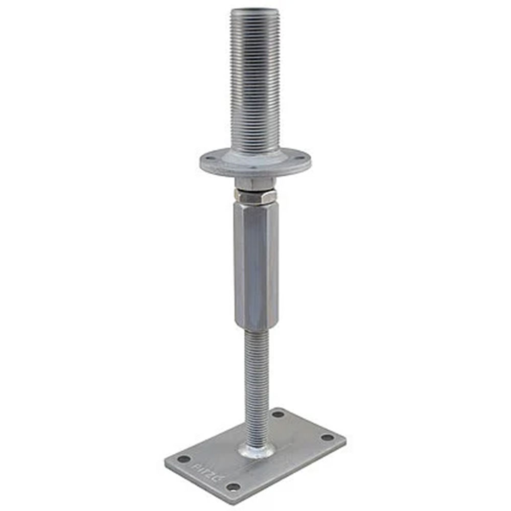 Obere Gewindestange (M 24 x 150 mm rechts) wird durch die obere Platte geschraubt und mit Mutter gesichert. Dadurch ist eine Grobeinstellung von 50 mm und eine Feineinstellung nach fertiger Montage über die rechts/links Muffe bis zu 65 mm möglich (komplette stufenlose Verstellbarkeit von 115 mm).