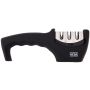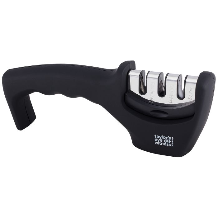 Dieser 3-stufige Messerschärfer von Taylor''s Eye ist für das Schärfen und Abziehen von Stahl- und Keramikmessern geeignet. Stumpfe Metallklingen werden zunächst drei bis vier Mal durch den Tungsten-Carbide-Schärfer gezogen. Anschließend erfolgt der Feinabzug mit den feinen Keramikstäben durch zwei- bis dreimaliges Durchziehen der Klinge. Metallklingen, die noch über eine gute Schärfe verfügen, sowie Keramikklingen können für den besonders feinen Abzug direkt mit den Diamantstäben geschliffen werden. Während des Schärfvorgangs sollte der Schärfer auf dem Tisch liegen, so dass das rutschhemmende Gummimaterial seine Wirkung voll entfalten kann.