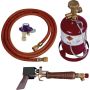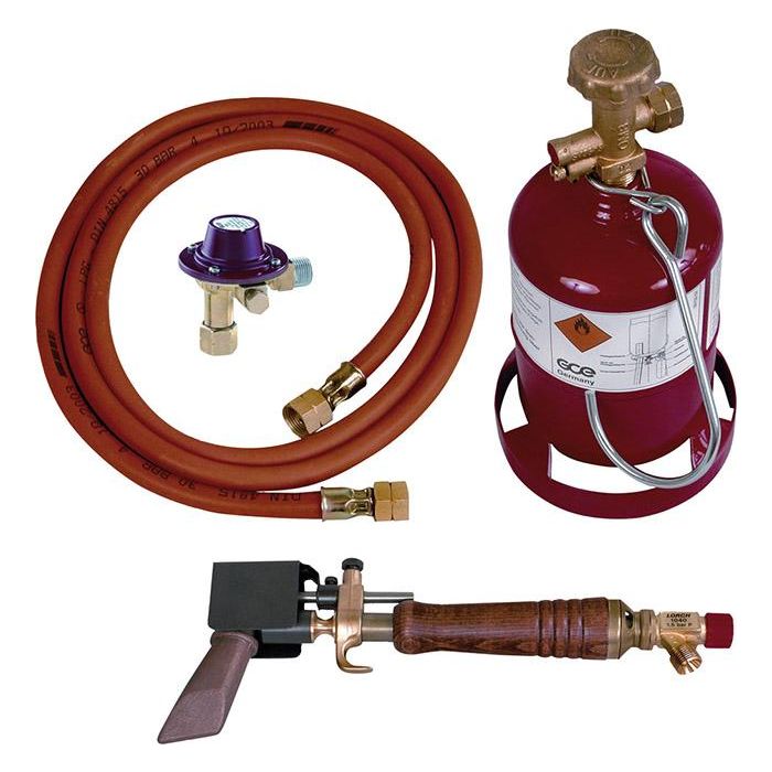 Lieferung: 1 Lötkolben mit Handgriff, 1 Kolbenbrenner mit Kolbenhalter, 1 Windschutz, 1 Kupferstück 350 g, Hammerform gekröpft, 1 HD-Schlauch 2 m, G 3/8" LH, 1 Kleinregler 1,5 bar, fest eingestellt, 1 Kleinstflasche 425 g Füllmenge mit Aufhängehaken.