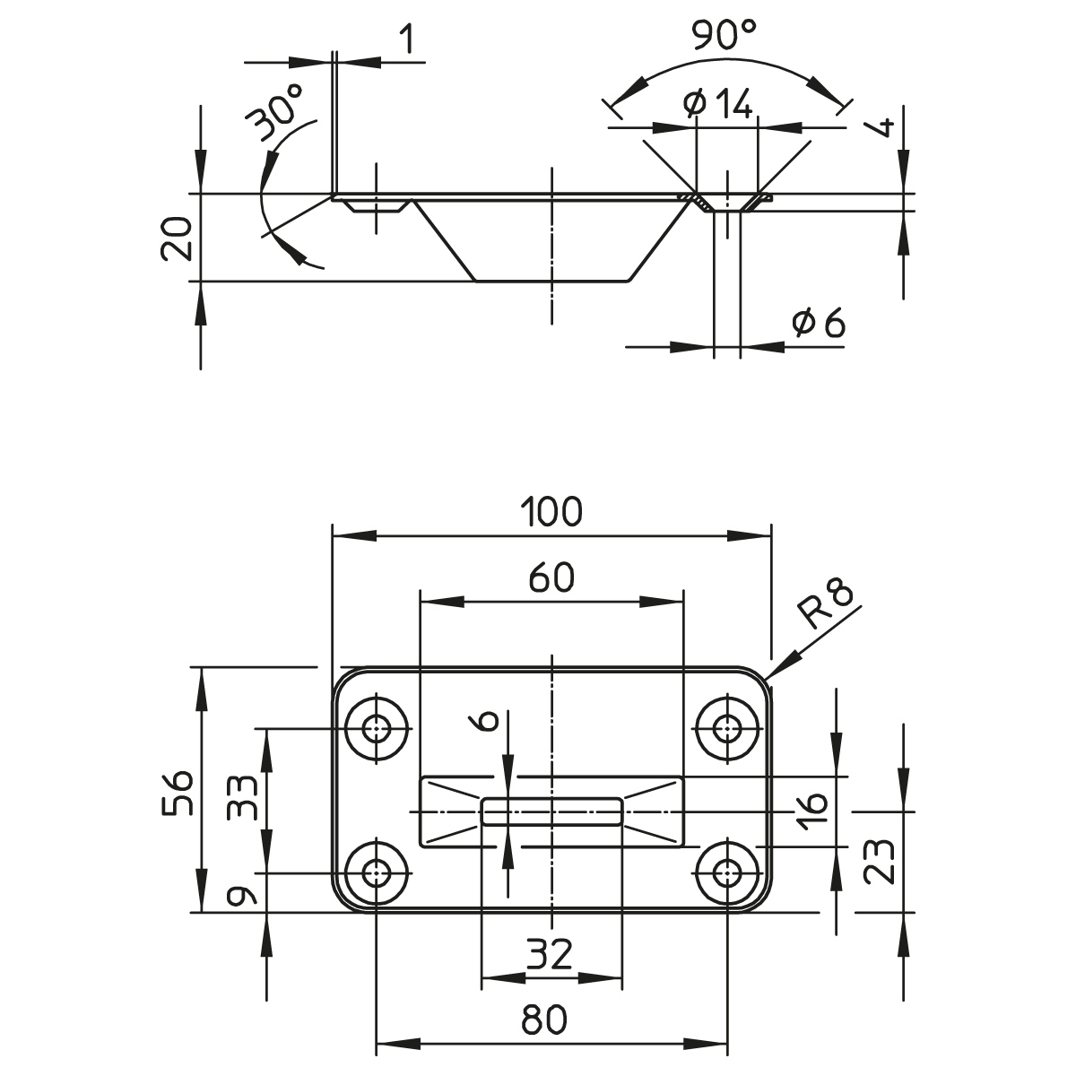 Durch die Bodenschließmulde kann eine Beschädigung des Bodenbelages durch die Treibriegelstange vermieden werden. Die umlaufende Abkantung schließt sauber mit dem Bodenbelag ab. Die größere der beiden Auflageflächen zeigt in Öffnungsrichtung des Standflügels. Durch die konische Form können Anschlagtoleranzen ausgeglichen werden.